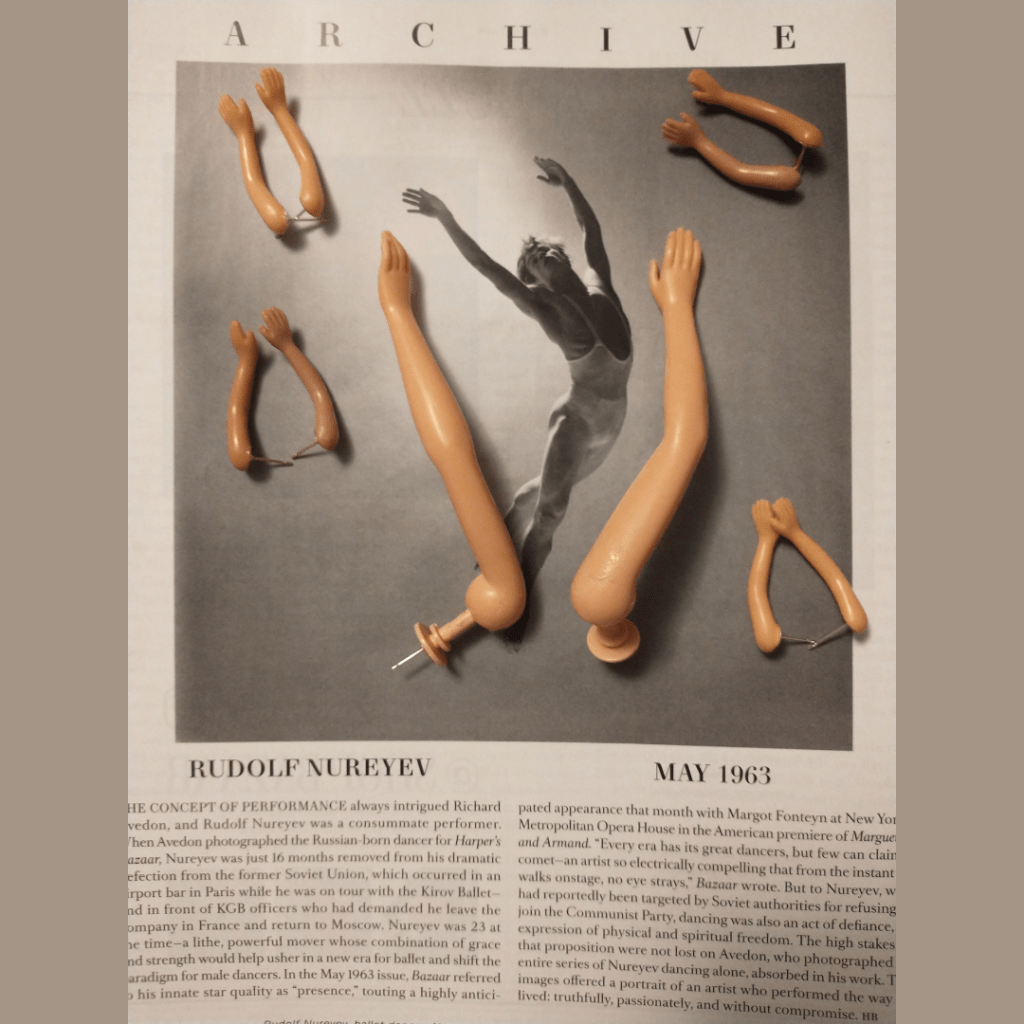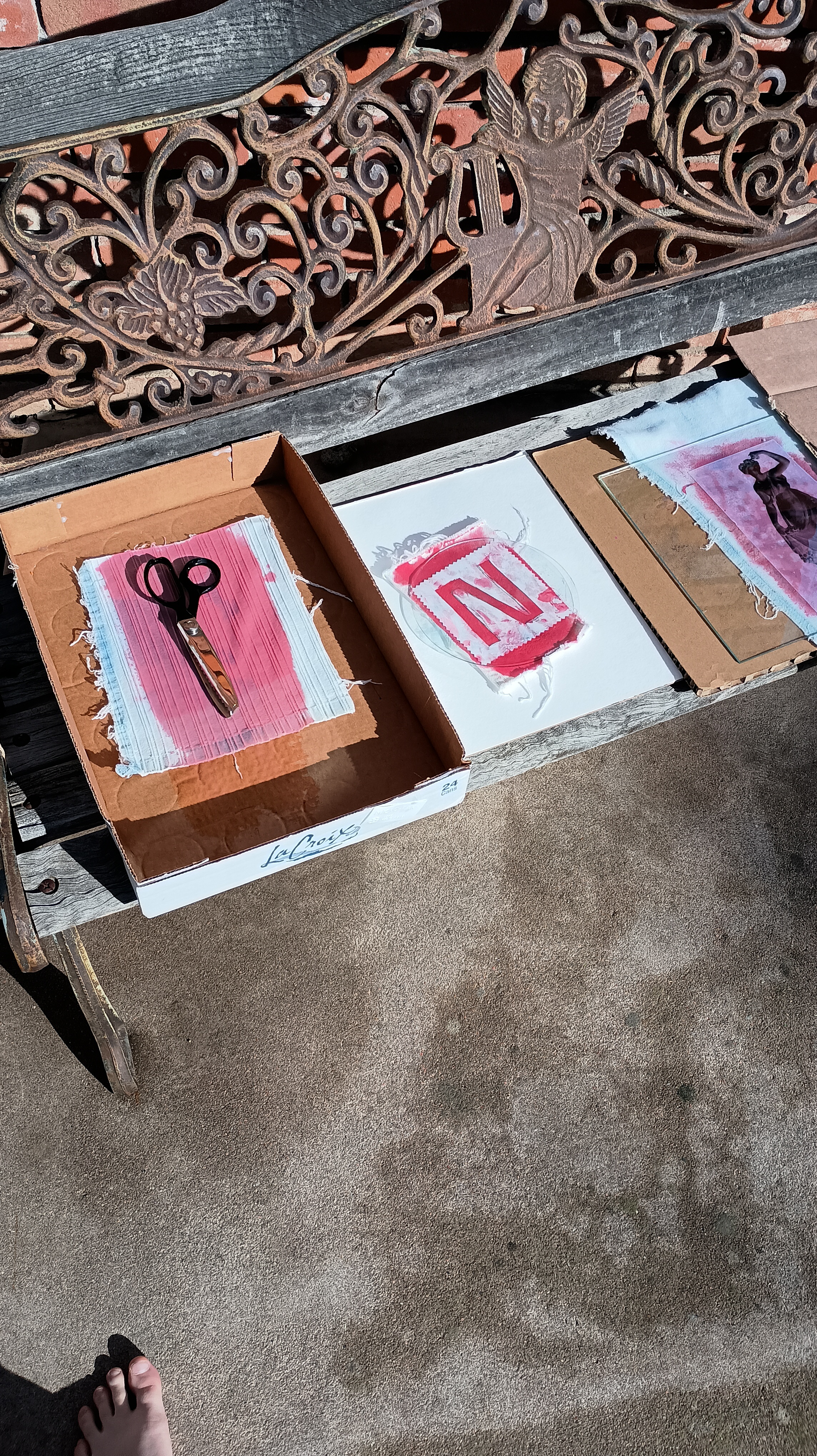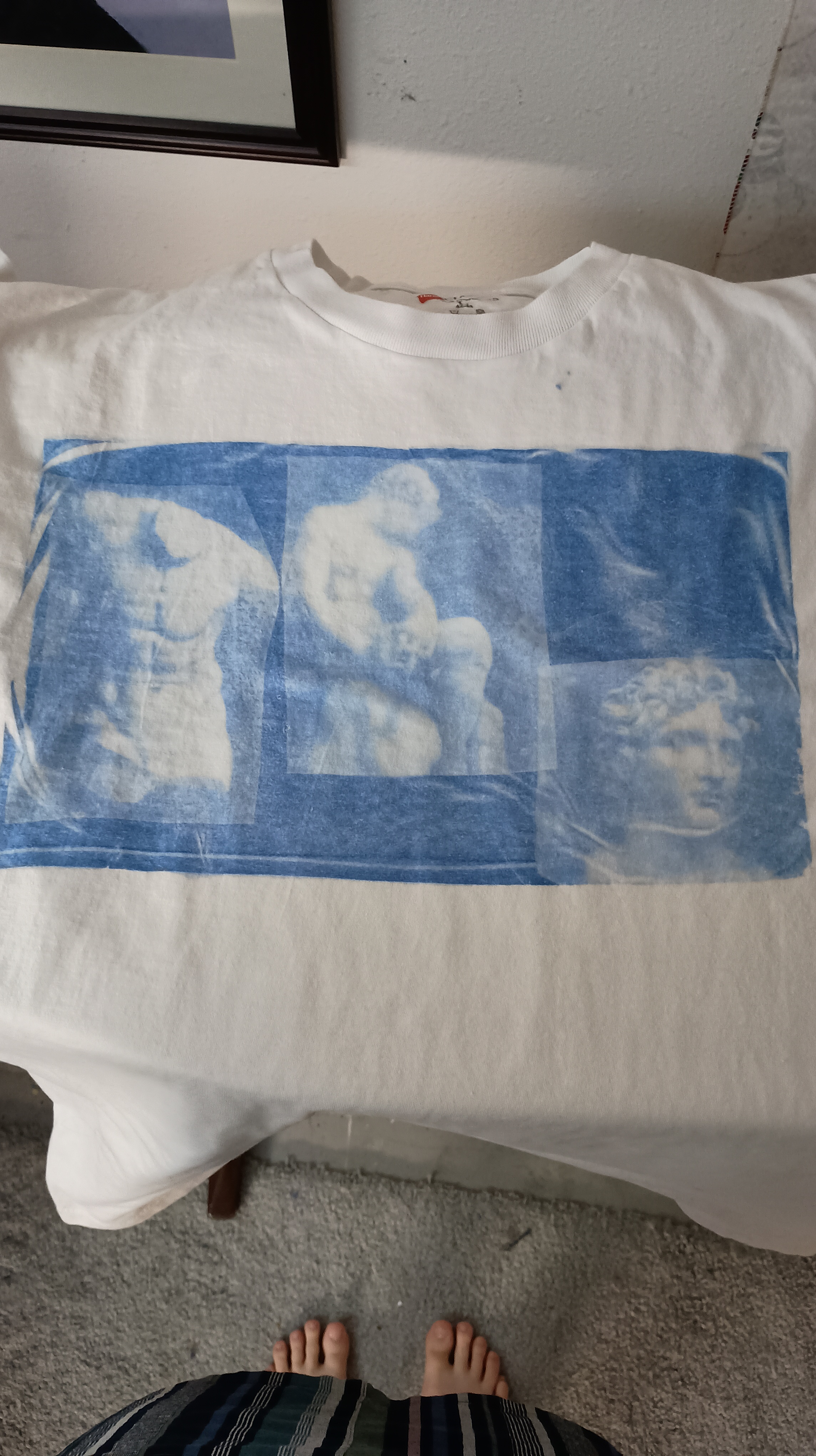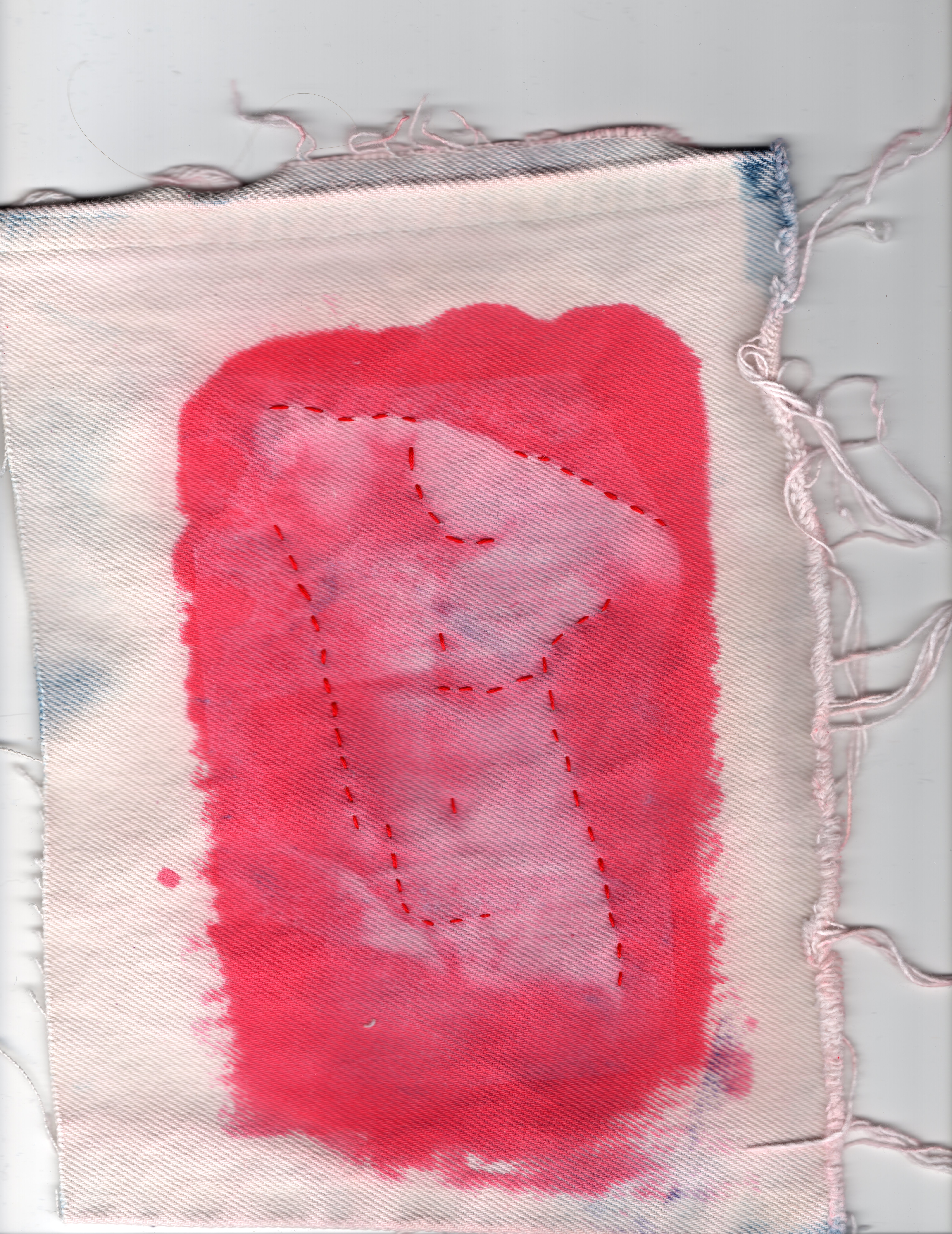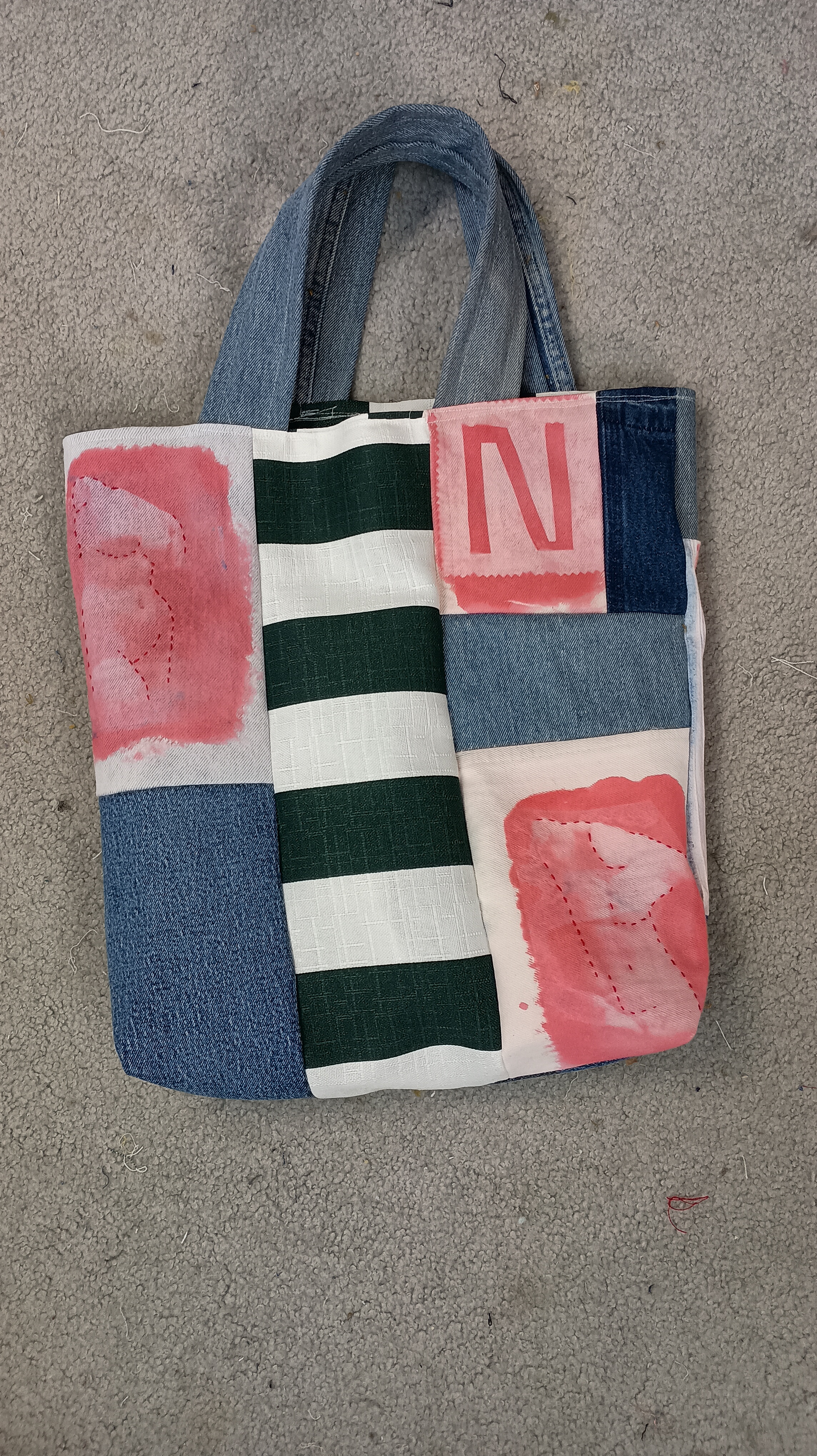 denim fabric, bleached and dyed with solar print ink and embroidered. Sewed with more denim scraps